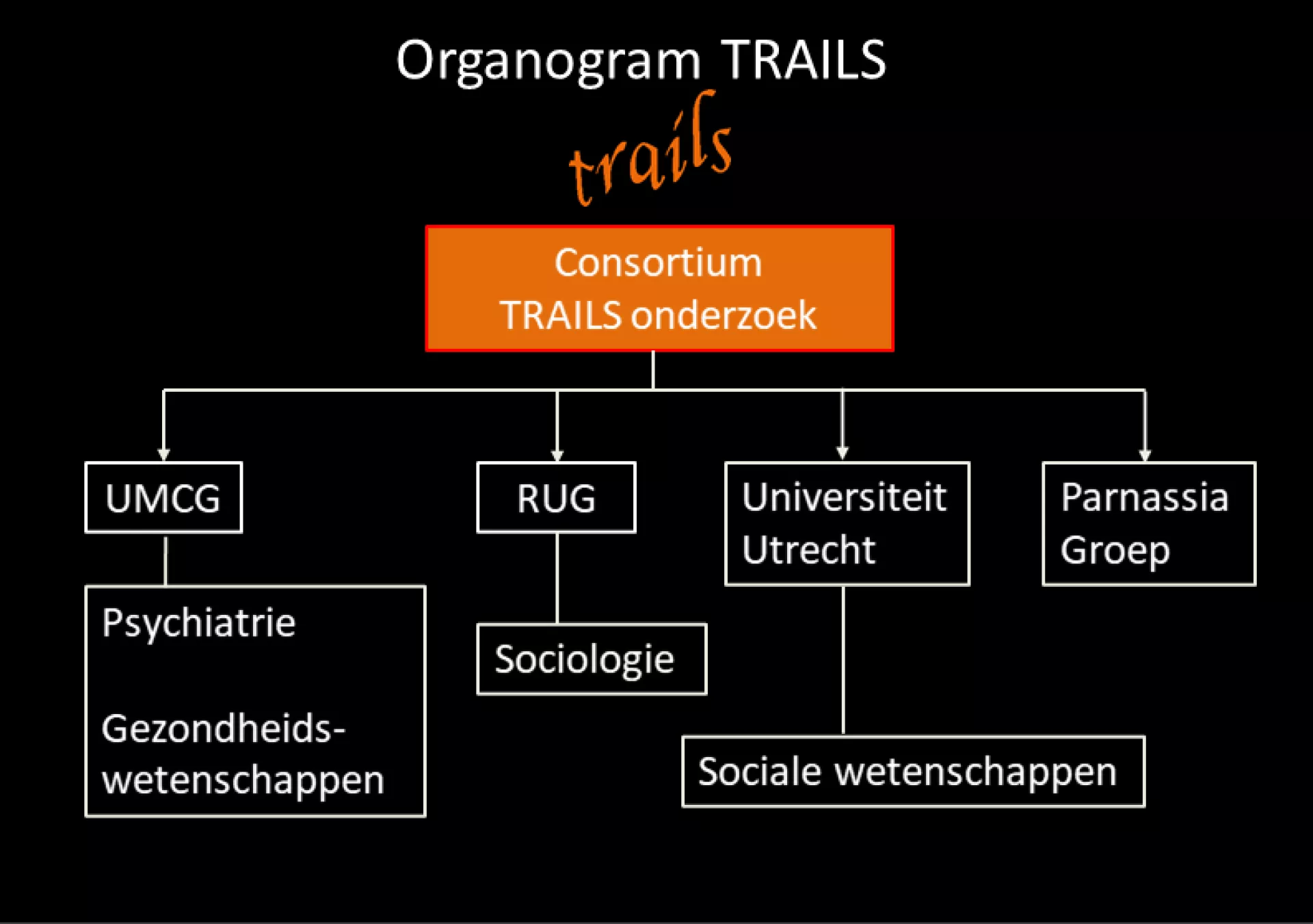 Team Home Over TRAILS Team Huidige:Betrokken universiteiten Betrokken universiteiten TRAILS wordt uitgevoerd door het Universitair Medisch Centrum Groningen, in samenwerking met de Rijksuniversiteit Groningen, de Universiteit Utrecht en de Parnassia Groep. Organogram TRAILS